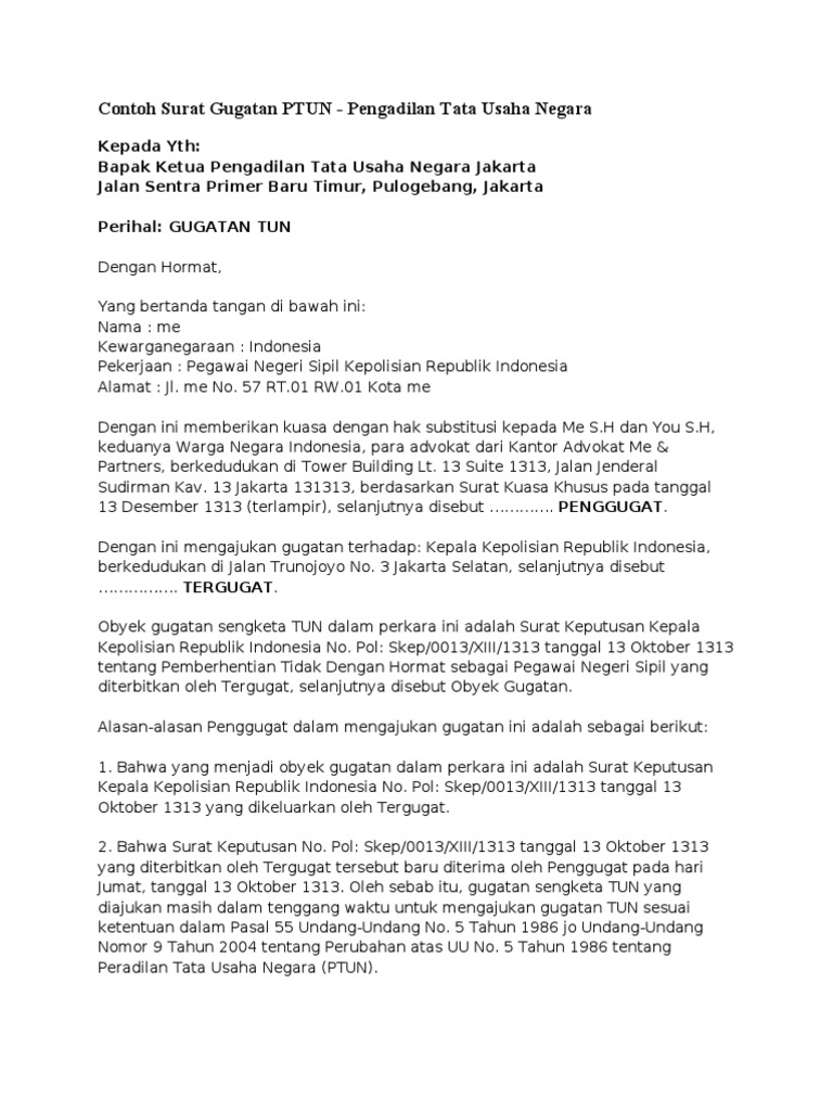 Contoh Surat Kuasa Khusus Dan Gugatan Tata Usaha Negara Pdf from imgv2-1-f.scribdassets.com Siapa yang membagi keputusan tata usaha negara? Sep 10, 2017 · 8. Apa yang disebut keputusan tata usaha negara? Kemudian ke polda ntb laporan pidana dilayangkan karena akibat sk pemecatan tersebut telah menimbulkan perasaan tak nyaman dan bahkan bisa pencemaran nama baik. Berikut contoh format surat gugatan dan surat kuasa pengadilan tata usaha negara makassar. Ketua pengadilan tata usaha negara (ptun) jakarta. Jun 18, 2019 · contoh gugatan dan putusan pengadilan tata usaha negara yang kedua adalah gugatan yang diajukan oleh warga bukit duri atas surat peringatan (sp) 1 (satu) yang dikeluarkan oleh kelapa satuan polisi pamong praja jakarta selatan. Keputusan tata usaha negara berdasarkan hukum perdata / merupakan perbuatan hukum perdata.